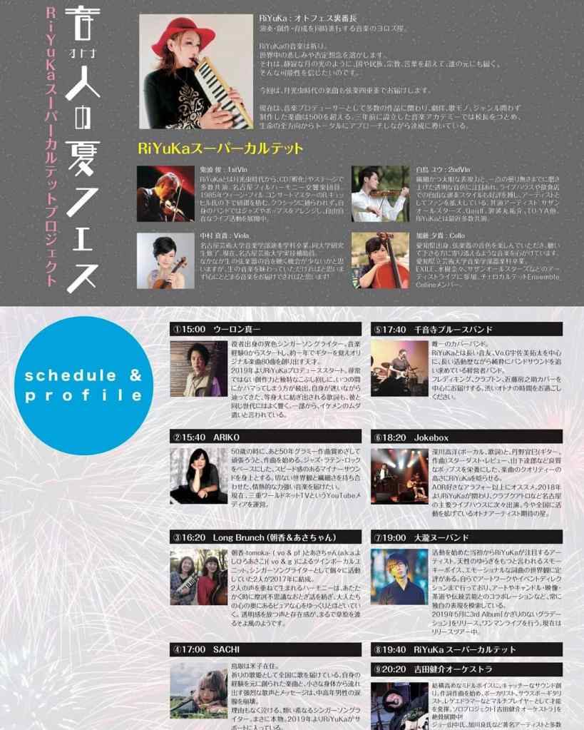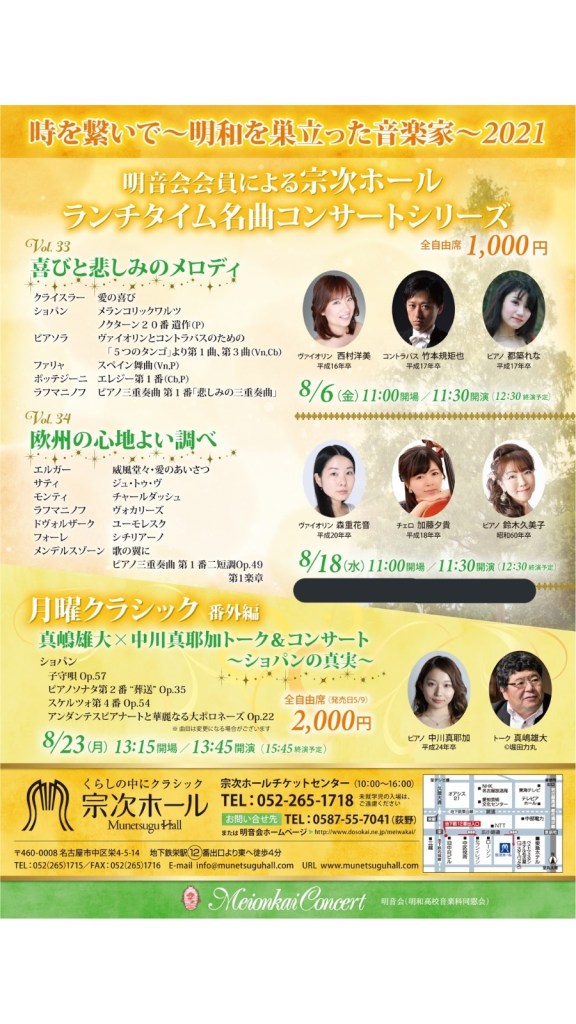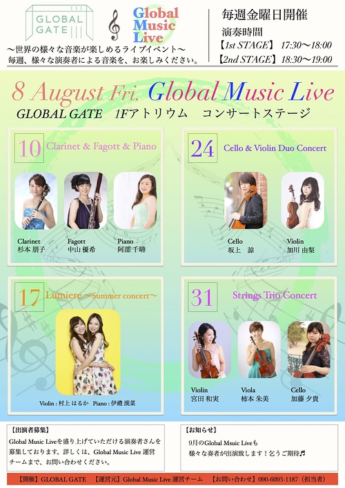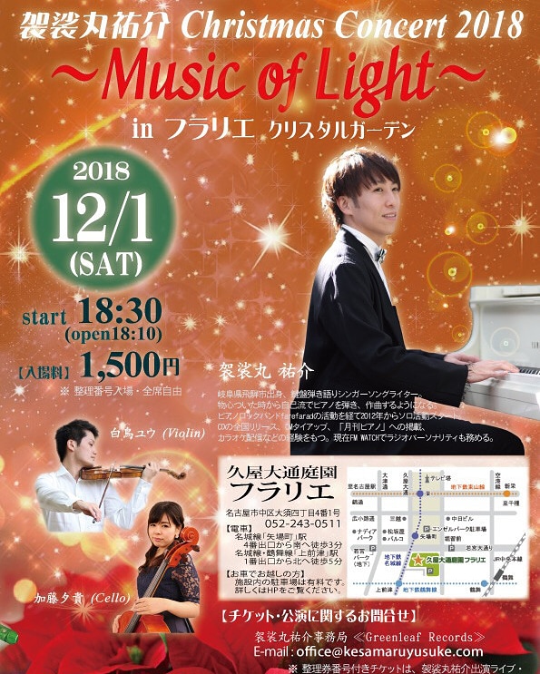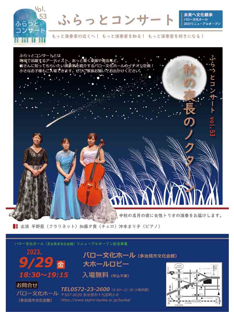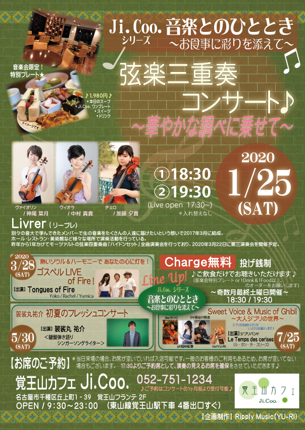 老人ホーム、病院などの介護医療施設、会社、ホテル、カフェ、レストラン、ショッピングモール、美術館、水族館、プラネタリウムなどでのイベント演奏。